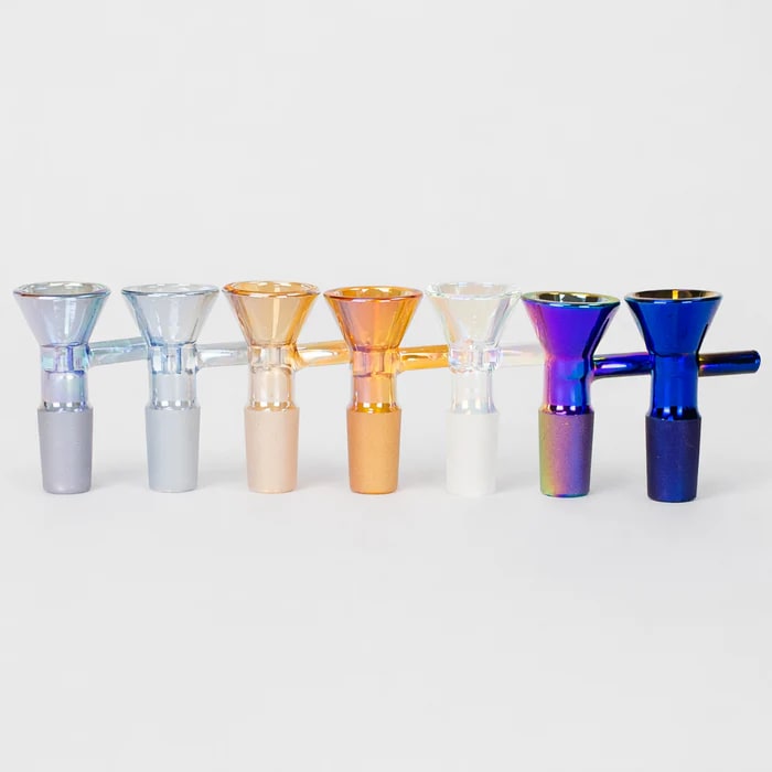 Brighten up your setup with these bold and beautiful 2-inch glass bowl pieces, designed with a clean 14mm male joint for a universal fit on most rigs and water pipes. Each piece features a solid glass bar handle. Crafted from heat-resistant borosilicate glass, these bowls combine durability with style, available in six stunning finishes: