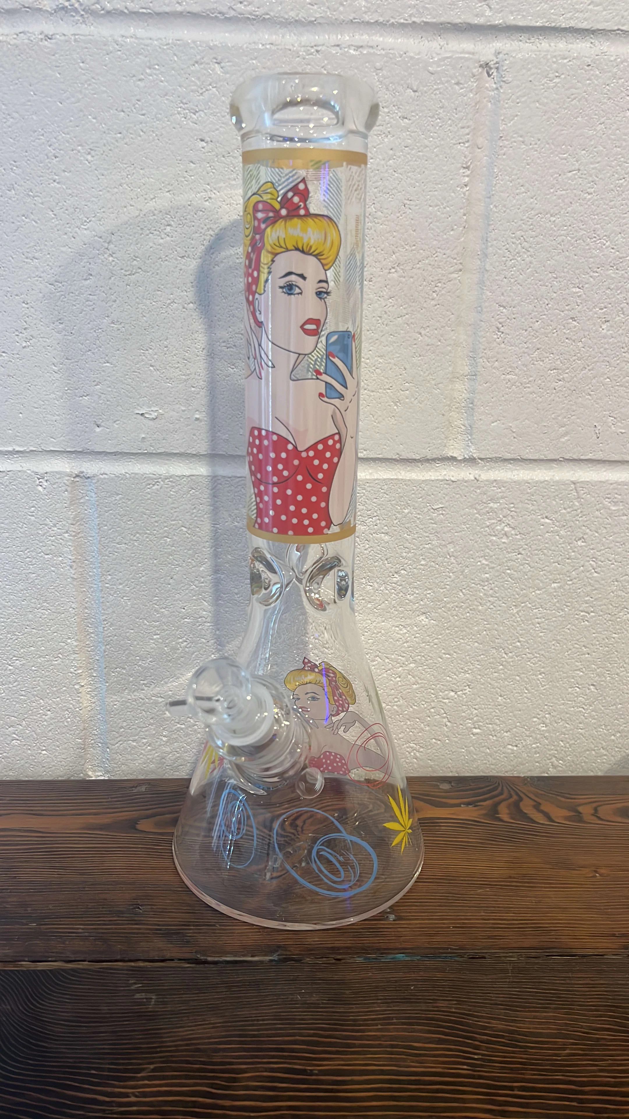 14” glass bong with graphic design of a blonde woman. The graphic appears twice. Built-in ice catch.